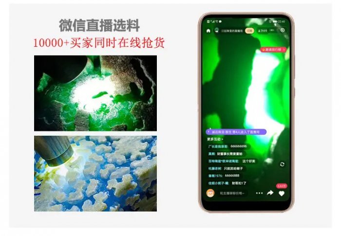 (←长按复制去微信加好友) 为什么选择我们 1.缅甸直供,无中间商,价格更低 我们家做翡翠几十年,有自己的货源渠道,现在直供很多大商城专柜。每一块都是矿主自留货源,不经任何中间商的炒作,为国内翠友搭建绿色购翠通道。 2.直播选料、切料,所见即所得 通过视频挑选,然后直接快递到您手中,非常便捷。所有翡翠原石均采用直播的方式供大家选择,每块原石不同,根据喜好选择。同时我们还直播切料保证原石与成品一致,让您买的放心。 3.每件必出检验证书 所有翡翠原石均为天然翡翠,并且每件必出检测证书。 从事翡翠行业一来,除了日常考察翡翠市场和交流外,我每天还会在朋友圈固定分享一些翡翠行情知识,给每一位刚接触翡翠的爱好者答疑解惑,这十几年来自己整理出来的一套关于翡翠玉石【场口,种水,选料,辨别,开料,加工,成品,挑选】的视频及学习资料,感兴趣的翠友可以加我微信: